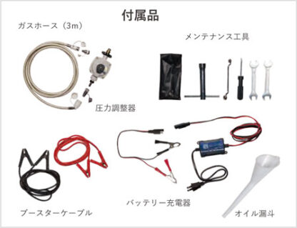 ・付属品:圧力調整器、ガスホース3m、バッテリー、メンテナンス工具、ブースターケーブル、バッテリー充電器、オイル漏斗